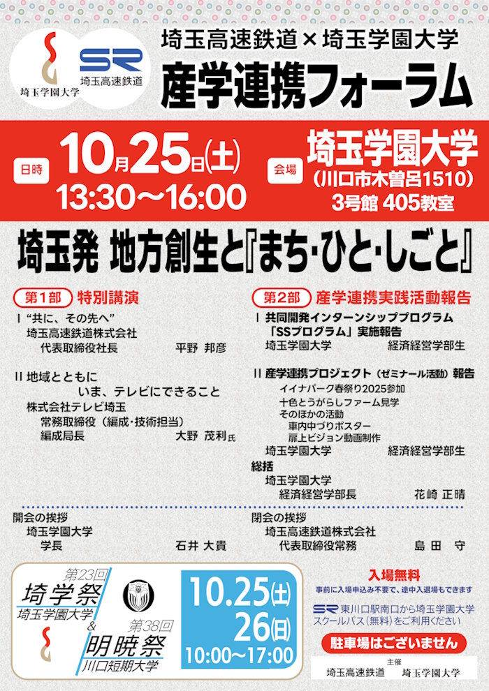 このたび、株式会社テレビ埼玉常務取締役(編成・技術担当)編成局長の大野茂利氏、埼玉高速鉄道株式会社代表取締役社長の平野邦彦氏にお越しいただき、「埼玉発 地方創生と『まち・ひと・しごと』」と題して、産学連携フォーラムを開催いたします。