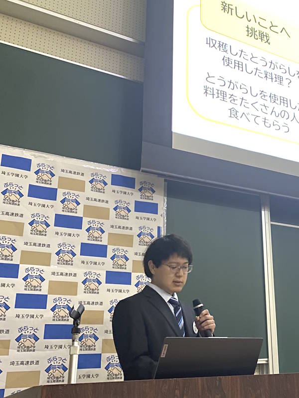 また、「イイナパーク春祭り2025」や、見沼田んぼの十色とうがらしファーム見学・収穫体験、埼玉高速鉄道車両内の中づりポスターを制作したことについて、主体的に取り組んできた経済経営学部がその取り組みを発表しました。