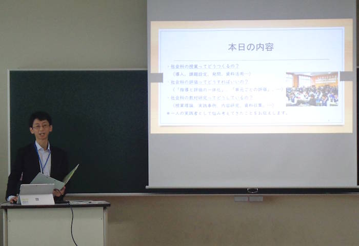 講義では、中学校社会科の地理・歴史・公民の模擬授業を通して、授業づくりや実践の具体についてご教授いただきました。