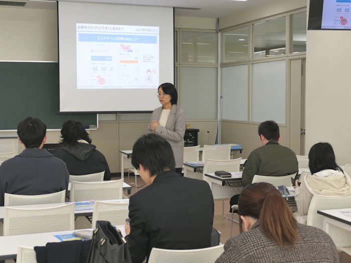 今回は、株式会社マイナビのキャリアエキスパート 池上愛由美 様をお招きし、就職活動WEBサイトを活用した、「企業のリストアップ」・「イベントや合同企業説明会への準備」・「自己分析・自己PRの作成」について学びました。