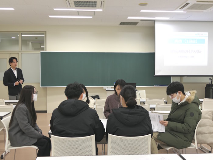 はじめに、「ディベート」「フリーディスカッション」「ケーススタディ」「インバスケット」といった主要な4つの形式について解説いただいた後、実践演習を実施しました。今回は1グループ6名とし、「リーダー」「書記」「タイムキーパー」を設定したうえで、テーマに基づき制限時間内で討論を行う「フリーディスカッション」に取り組みました。